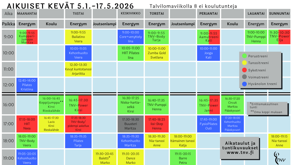 Pidätämme oikeudet muutoksiin. Tunnit toteutuvat, mikäli kävijöitä on jatkuvasti vähintään 8.