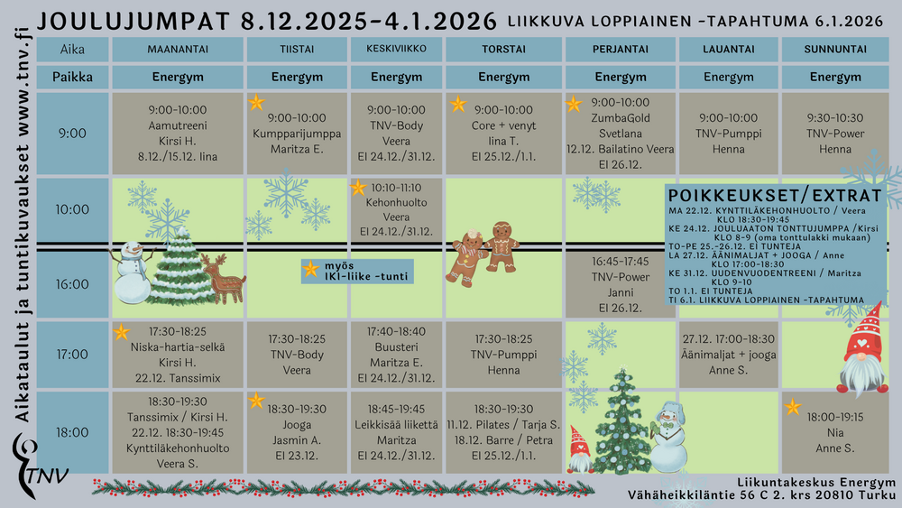 Joulujumppien aikataulu 8.12.2025-4.1.2026