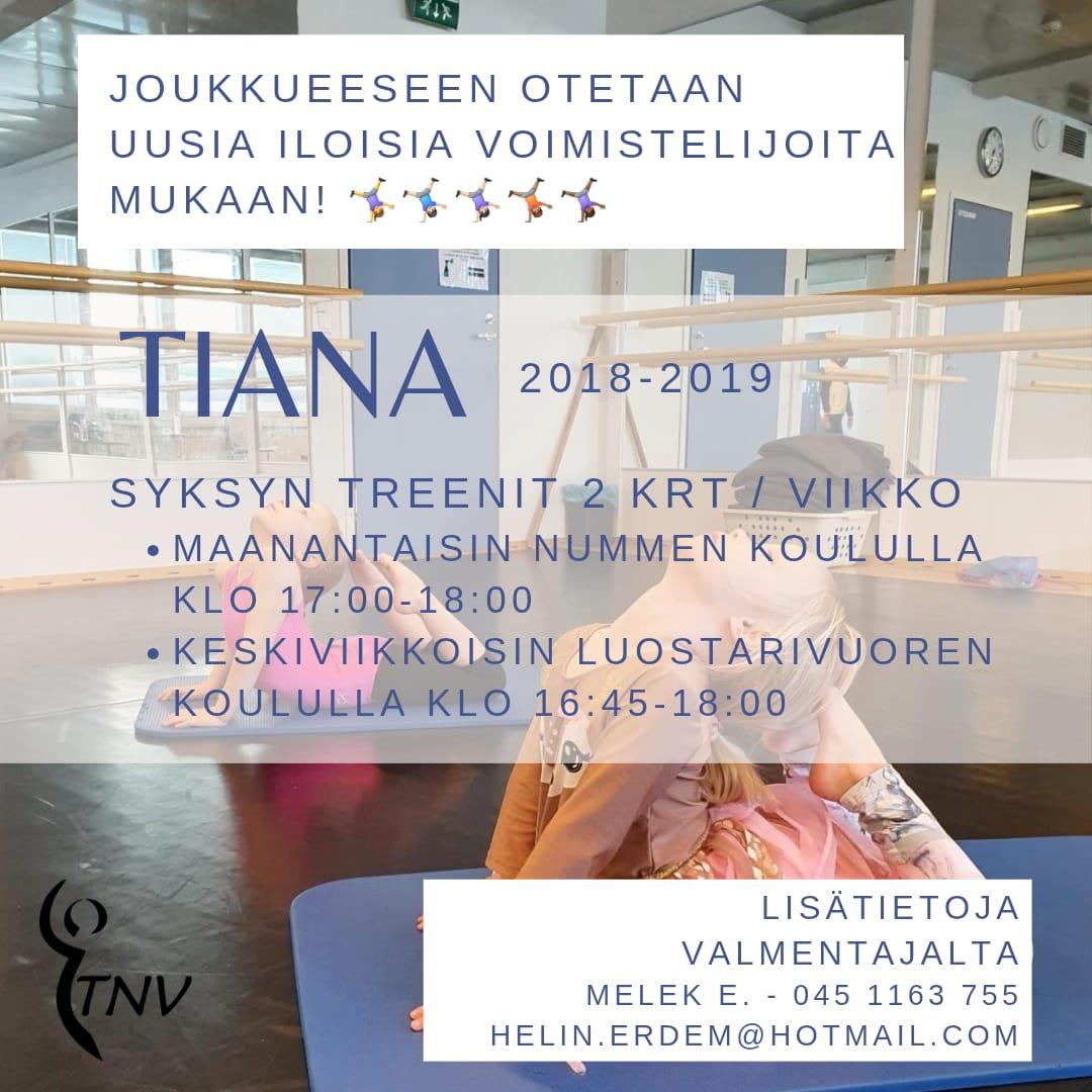 Tiana-joukkue on tarkoitettu 2018-2019 syntyneille joukkuevoimistelusta kiinnostuneille. Harjoituksissa tutustutaan joukkuevoimistelun alkeisiin leikinomaisin keinoin. Ryhmässä harjoitellaan perusvoimistelutaitoja kuten ketteryyttä, liikkuvuutta, kehonhallintaa sekä esteettisen liikunnan taitoja iänmukaisin keinoin. Tärkeintä kuitenkin on ilo ja liikunnan riemu, joka mahdollistetaan positiivisella ja kannustavalla ilmapiirillä.