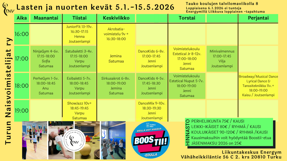 Keväälle voi ilmoittautua mukaan niihin ryhmiin, joissa on tilaa. Kevään ilmoittautuminen avataan ma 9.12.2025 klo 12:00, tervetuloa mukaan!