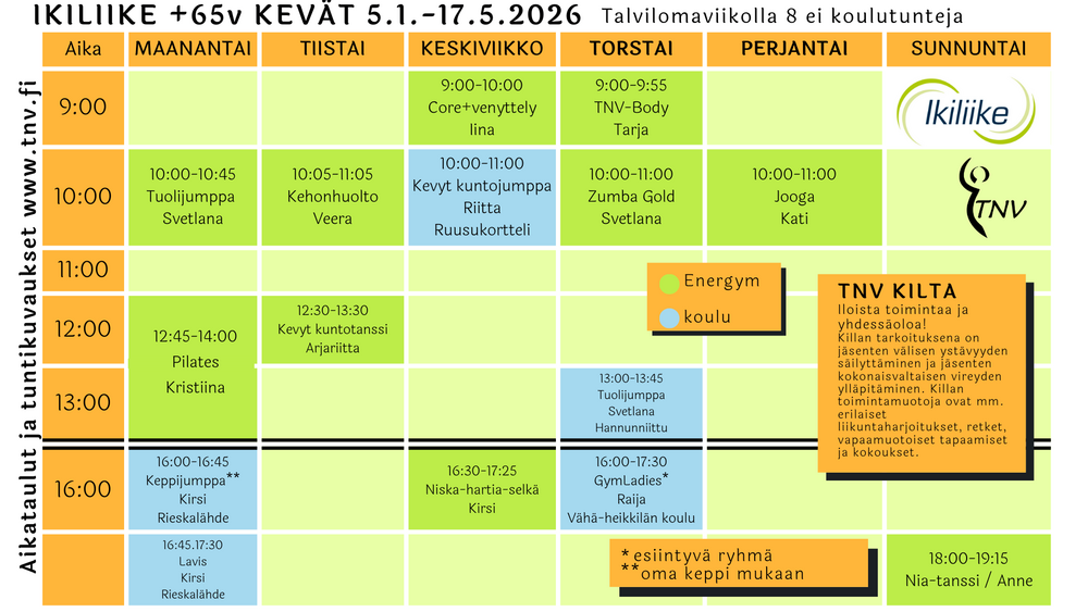TNV tarjoaa senioreille laajaa ja monipuolista liikuntatoimintaa. Toimintaa kehitetään jatkuvasti saadun palautteen pohjalta. Energymin ja koulujumppien aikuisten tunneille on mahdollista osallistua iästä riippumatta. Ikiliike +65v aikatauluun on valittu monipuolisesti erilaisia senioritunteja. Senioreilla on myös mahdollisuus hankkia seniorihintaan aikuisten tunneille jumppakortti.