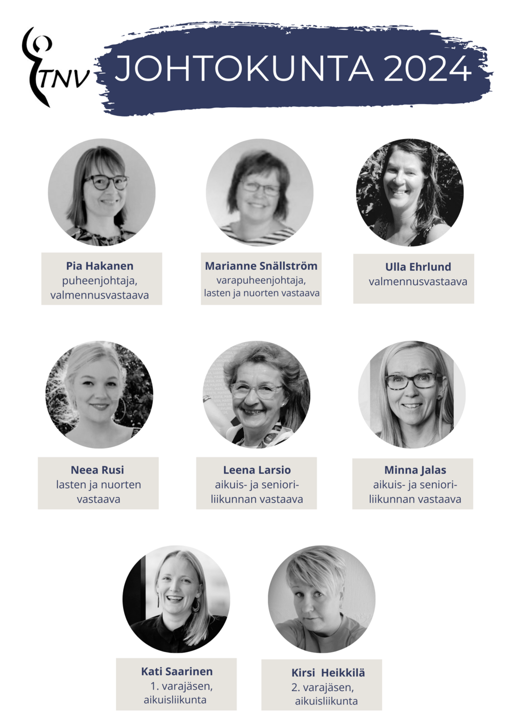 Olen koulutukseltani fysioterapeutti ja voimistelu ja nimenomaan joukkuevoimistelu ovat siis aina olleet lähellä sydäntäni. Nyt toimin jäsenenä valmennussektorissa, jossa tarkoituksenamme on kehittää ja laajentaa TNV:n joukkuevoimistelutoimintaa. On kiva olla mukana kehittämässä perinteistä turkulaista seuraa, toivottavasti nähdään seuran tapahtumissa tai hikoillaan yhdessä Energymillä jumpassa!