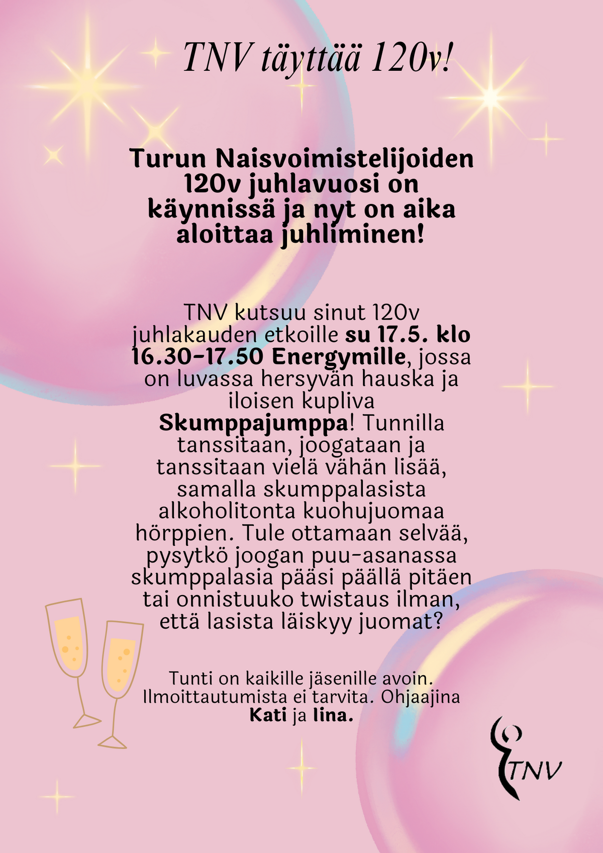 Tervetuloa juhlimaan seuran synttäreiden etkoja sunnuntaina 17.5. klo 16:30-17:50 Energymille. Ohjelmassa on Skumppajumppa, joka on hulvaton sekoitus tanssia ja joogaa. Tanssiosuudessa jorataan helppoja tanssimuuveja ja joogassa tehdään keholle ja mielelle hyvää tekeviä asanoita. Kaikkea tätä liikunnan iloa höystää lasillinen alkoholitonta kuohujuomaa, jota hörpitään tunnin aikana mitä yllättävimmissä kohdissa! Tervetuloa mukaan irrottelemaan, kokemaan uutta ja pitämään hauskaa rennossa ilmapiirissä!