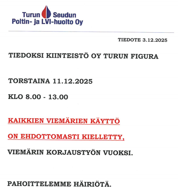 HUOM! ENERGYMIN VIEMÄRIT OVAT KÄYTTÖKIELLOSSA TORSTAINA 11.12. KOKO AAMUPÄIVÄN. HUOMAATHAN, ETTÄ VESSAT, SUIHKUT JA HANAT EIVÄT OLE KÄYTÖSSÄ. EDES JUOMAPULLOA EI VOI TÄYTTÄÄ. HUOMIOITHAN TÄMÄN…