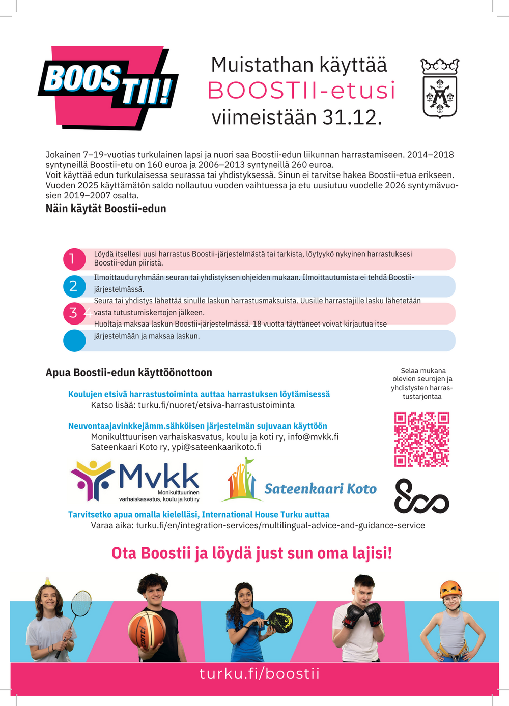Olethan muistanut käyttää Boostii-etusi? Vuonna 2025 Turun kaupunki aloitti uuden Boostii-edun käytön. Etu on tarkoitettu turkulaisille lapsille ja nuorille tukemaan liikuntaharrastamista. Vuonna 2025…