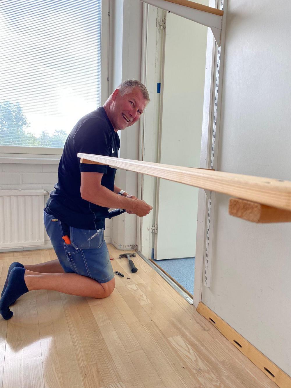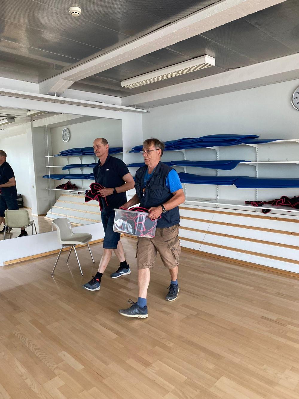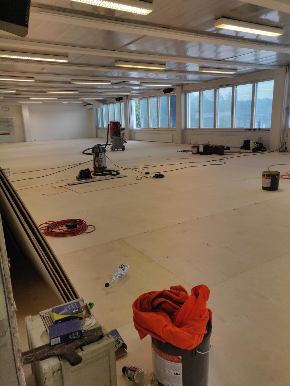 Remonttiviikko alkoi Energialähteen välineistön tyhjennyksellä talkooväen voimin. Viikon mittaan vanha lattia on hiottu ja vaneroitu ja uutta mattoa liimaillaan parhaillaan. Vielä viimeistellään maton saumaukset, ovet ja reunojen jalkalistat kiinni. Sunnuntaina talkootiimi tulee taas laittamaan Energialähteen välineistön takaisin paikoilleen.