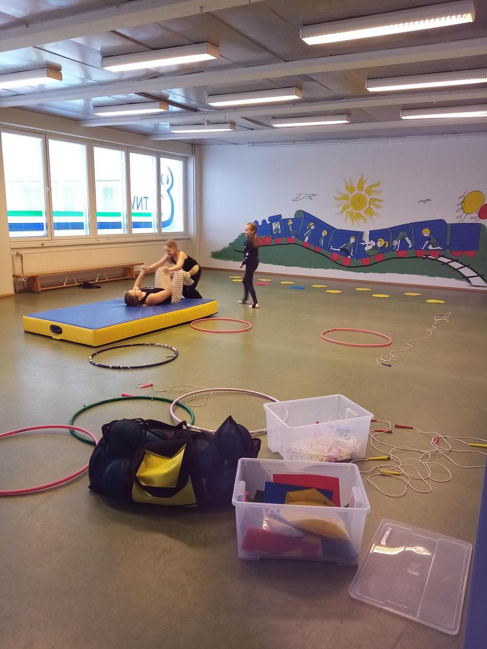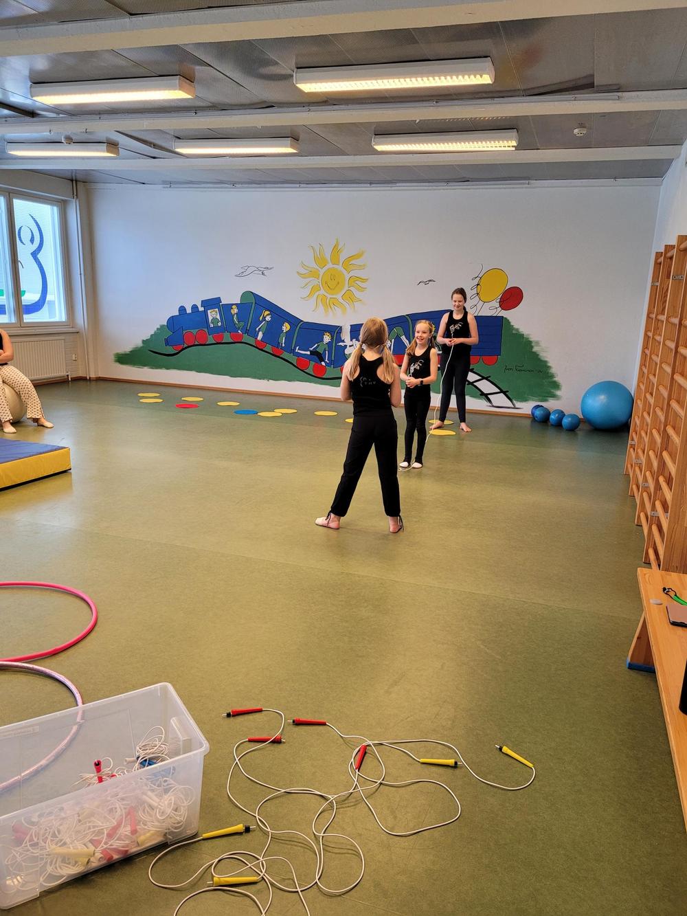 Energymin tiloissa päästiin kokeilemaan laajalti eri välineistöä hyppynaruista ja hulavanteista, jättijumppapalloihin ja hernepusseihin. Leiriläiset pääsivät harjoittelemaan käsilläseisontaa ja kävelyä, akrobatiaa ja hyppyjä. Myös pallonpäällä kävelyä, puolapuilla kiipeilyä ja tarkkuusheittoja oli ohjelmassa. Jokainen lähti rohkeasti kokeilemaan ja oppimaan uutta.