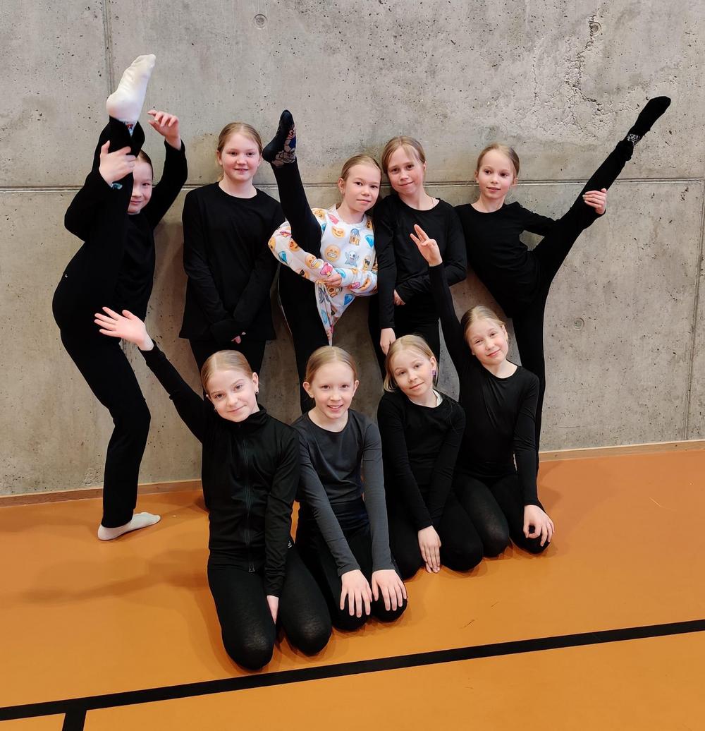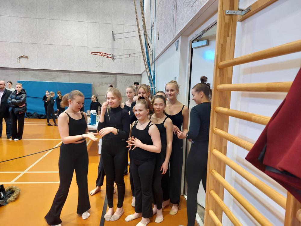 Kaikilla joukkueilla oli aikaa lämpätä ja valmistautua rauhassa omaa esitystä varten. Vielä hiottiin yksityiskohtia kuntoon ja tsempattiin yhdessä tiiminä ennen omaa esitysvuoroa. Alla omia tsemppejä käy läpi Tuike, Tiera ja Evelia.