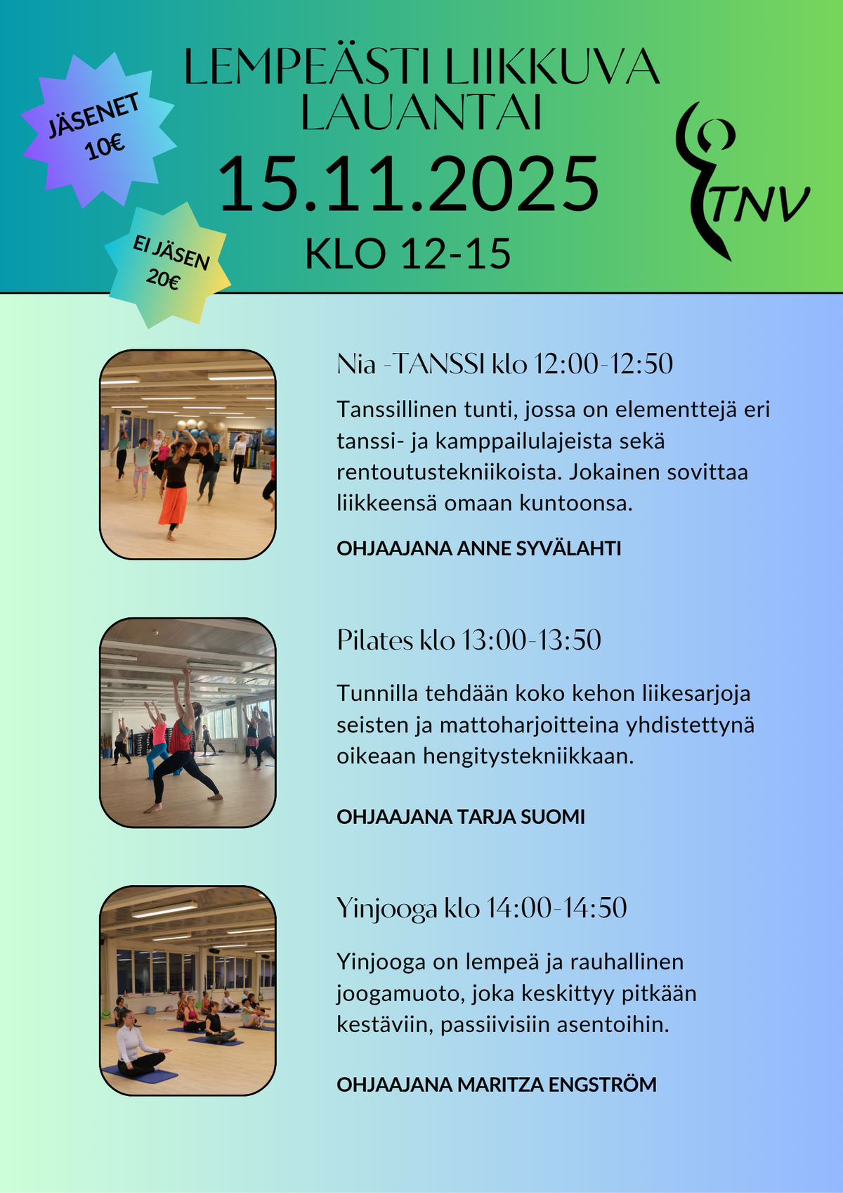 Lempeästi liikkuvan lauantain tunneilla luvassa niaa, pilatesta ja joogaa. Energymin aulassa on kahvi, tee ja smoothietarjoilu tapahtuman ajan.