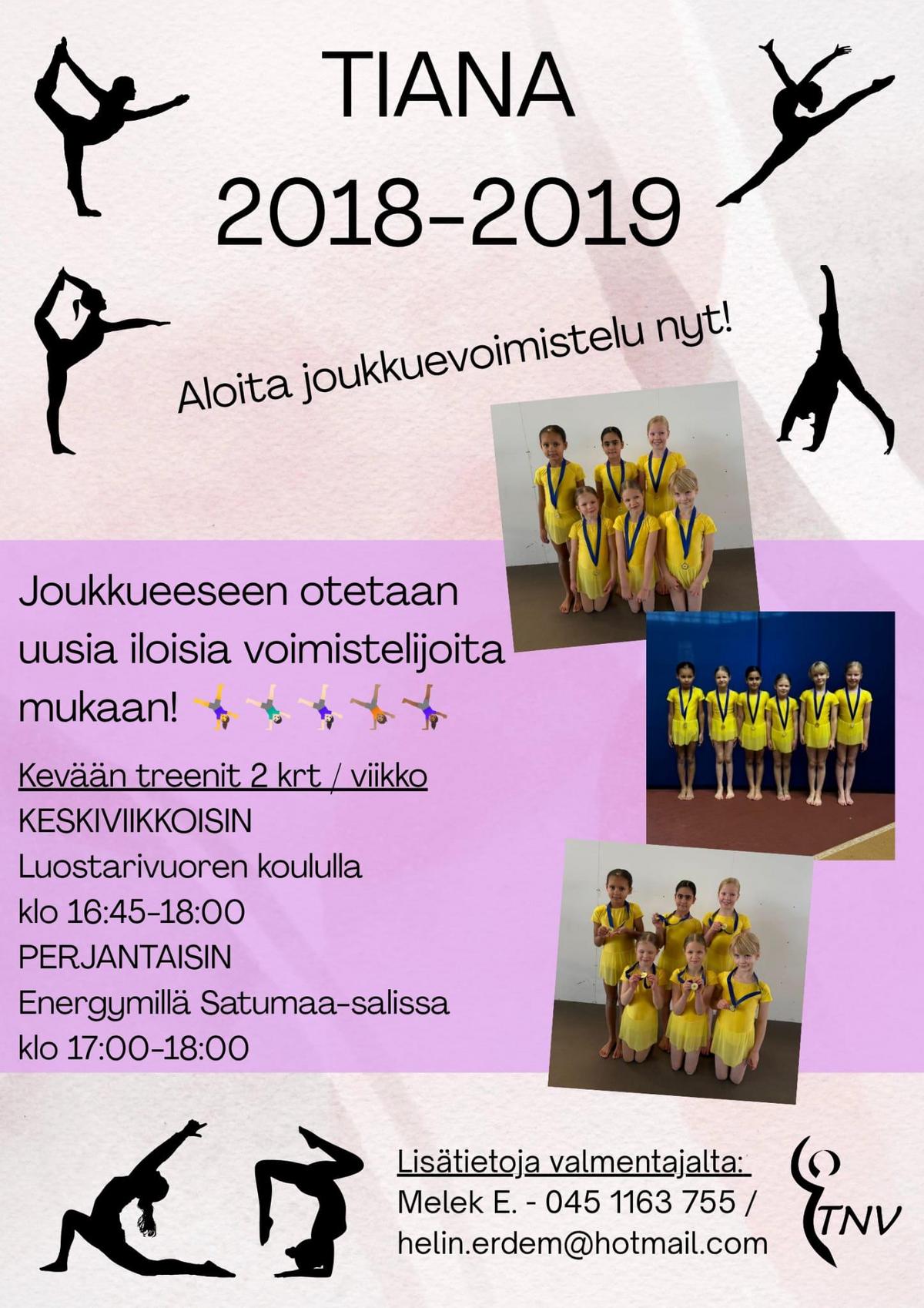 Joukkuevoimistelujoukkue Tiana hakee nyt uusia voimistelijoita mukaan joukkueeseen. Tiana harjoittelee keväällä 2026 kaksi kertaa viikossa. Joukkueen treenit ovat: