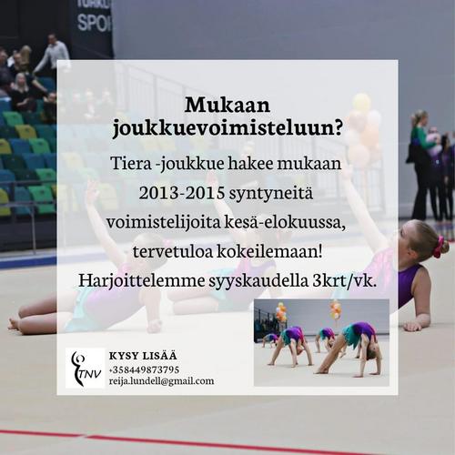 TNV:n 2014-2015 syntyneiden Tiera-joukkueessa harjoitellaan voimistelun perustaitoja iloisella mielellä! Tiera ottaa mukaan joukkueeseen uusia tyttöä, ota rohkeasti yhteyttä valmentajaan. Joukkue treenaa syksyllä 3 krt viikossa.